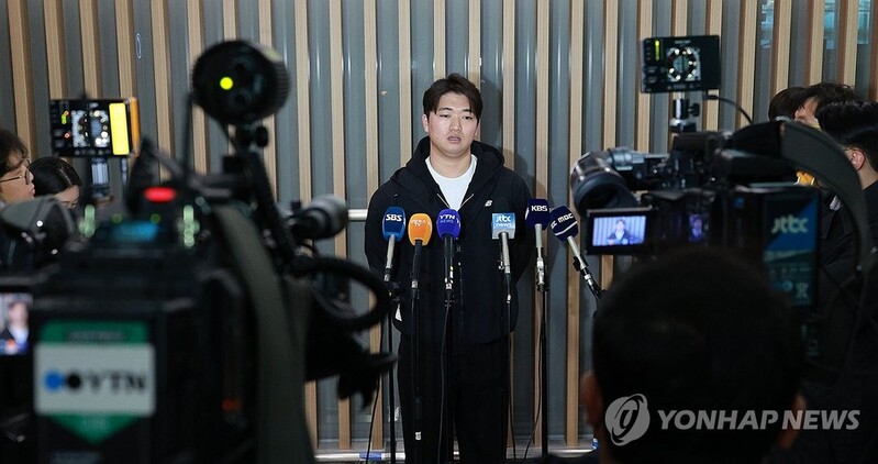 | ▲ 취재진 질문에 답하는 고우석 (영종도=연합뉴스) 한종찬 기자 = 미국프로야구 메이저리그 샌디에이고 파드리스와 계약한 고우석이 9일 오후 스프링캠프에 참석하기 위해 미국으로 출국하며 취재진 질문에 답하고 있다. 2024.2.9 saba@yna.co.kr |