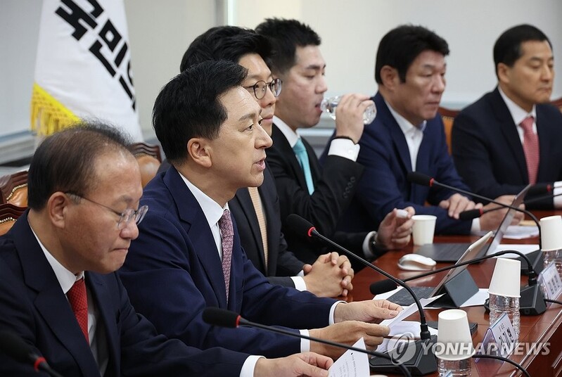 | ▲ The leader of the ruling People Power Party, Rep. Kim Gi-hyeon (2nd from L), is seen speaking at the party's leadership meeting at the National Assembly in Seoul, on Oct. 5, 2023. (Yonhap) |