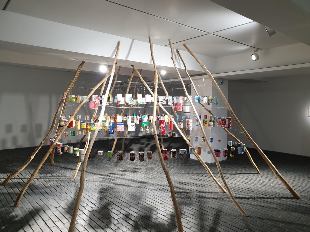 어린 시절 깡통이나 종이컵을 줄로 연결해 소리를 전달했던 방식과 유사하게 여러 개의 깡통을 줄로 연결하고 나뭇가지에 매달아 서낭당 모양으로 만든 이 작품은 왜곡되는 커뮤니케이션의 본질을 되묻는다. 전시에서는 당시 드로잉도 함께 볼 수 있다.