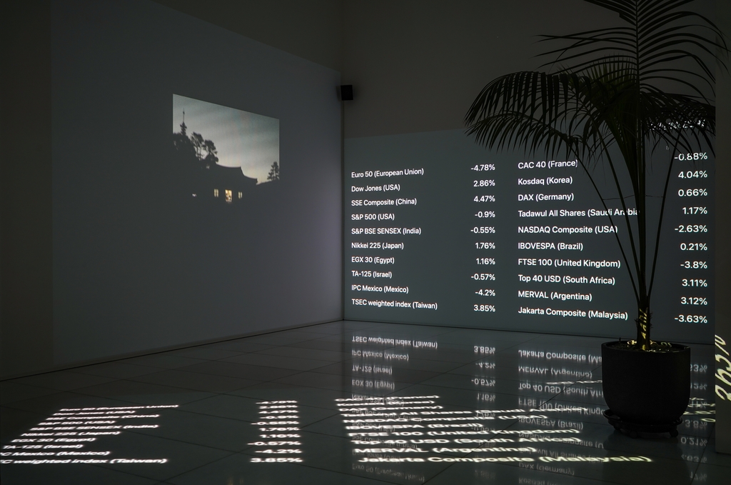 어두컴컴한 1층 전시장에는 절의 새벽 타종 소리가 울려 퍼지는 가운데 지리산 자락 실상사의 모습과 전 세계 주식시장의 실시간 시세가 벽에 투사된다. 자본주의를 상징하는 주식 시세와 명상을 위한 종소리가 뒤섞인 이 작품은 작가의 90년대 영상작품인 '주식거래'를 새롭게 재해석한 '주식정원-템플'이다.