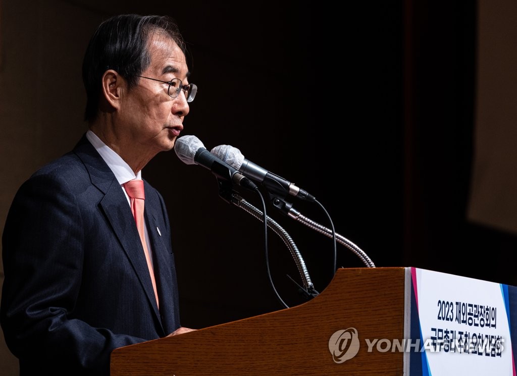 Han also called on the diplomats to do their best to support South Korea's bid to host the 2030 World Expo in the southern port city of Busan.