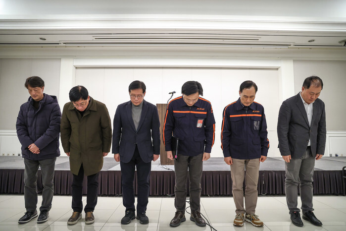 Jeju Air CEO Kim E-bae (3rd from R) and other company officials express their apologies ahead of a press conference held in Seoul on Dec. 29, 2024, hours after the deadly crash of one of its flights at Muan International Airport in Muan, 288 kilometers southwest of Seoul. (Yonhap)
