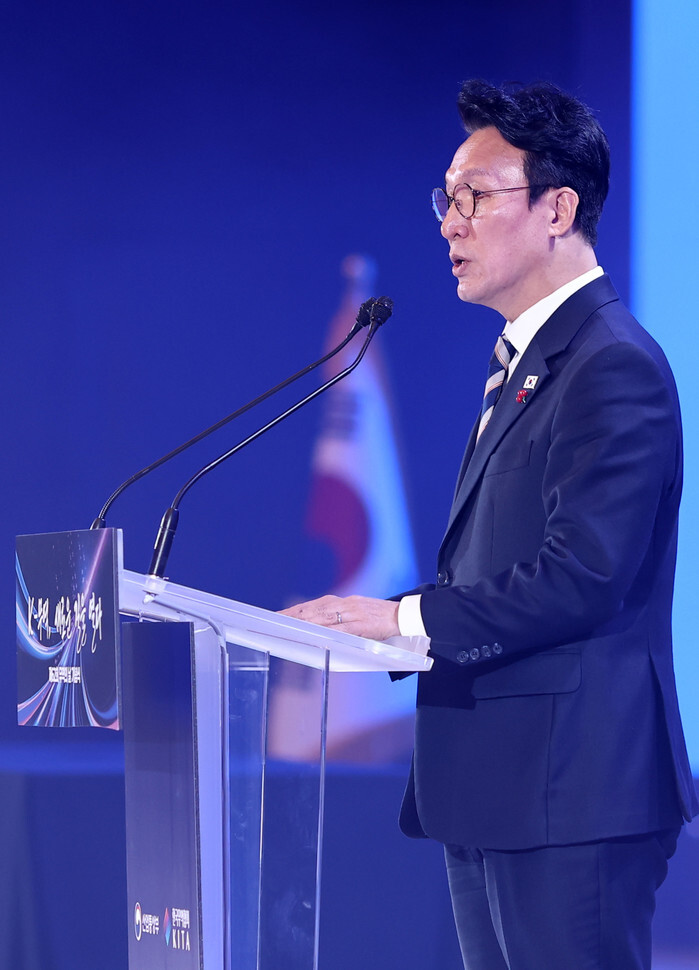 Prime Minister Kim Min-seok speaks during a ceremony to mark the 62nd Trade Day at the COEX exhibition center in Seoul on Dec. 4, 2025. (Yonhap)