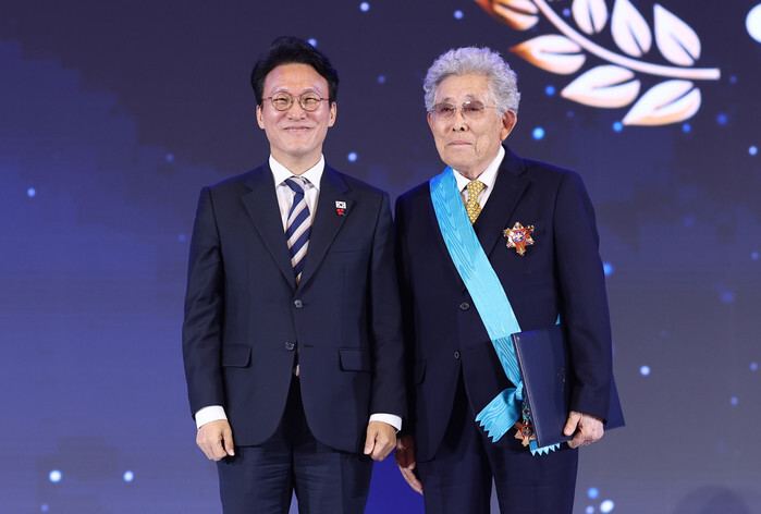 Prime Minister Kim Min-seok (L) poses for a photo with Bang Tae-yong, chief of Bukwang Metal Co., after conferring the Gold Tower Order of Industrial Service Merit on Bang for the company's outstanding record in exports this year during a ceremony to mark the 62nd Trade Day at the COEX exhibition center in Seoul on Dec. 4, 2025. (Yonhap)