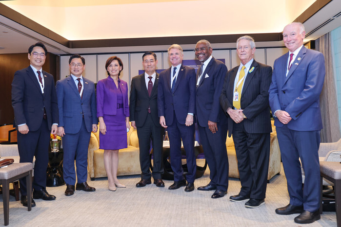 South Korean Defense Minister Shin Won-sik (4th from L) poses for a photo with a delegation of U.S. House of Representatives at the Shangri-La Hotel in Singapore on June 1, 2024, before holding talks with them on the sidelines of the 21st Shangri-La Dialogue, a regional security forum. (Yonhap)