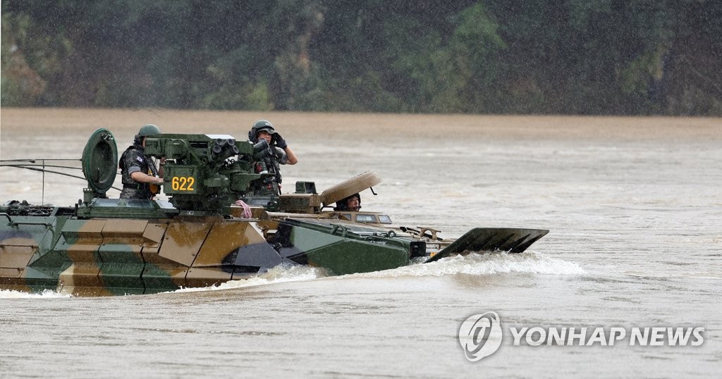 ▲ A Marine Corps amphibious assault vehicle is mobilized in a search for missing people in the Sam River in Yecheon, 161 kilometers southeast of Seoul, on July 18, 2023, where about 30 residents were reported to have been killed or gone missing following massive landslides triggered by torrential rain. (Yonhap)