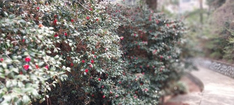 대략 11월 말부터 이듬해 2∼3월 사이 붉은색 동백꽃이 만발한다.