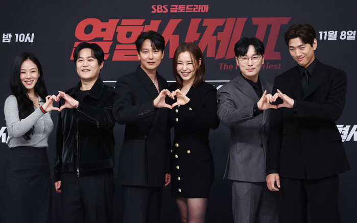 The stars of the new drama "The Fiery Priest Season 2" -- Kim Hyun-seo, Kim Sung-kyun, Kim Nam-gil, Lee Honey, Seo Hyun-woo and Sung Jun (L to R) -- pose for a photo during a publicity event in Seoul on Nov. 8, 2024. The first episode of the drama will air on SBS TV network the same day. (Yonhap)