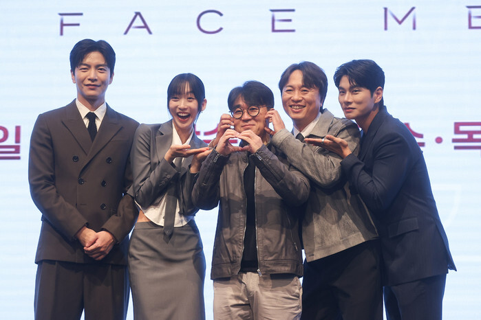 The stars of the new drama "Face Me" -- Lee Min-ki, Han Ji-hyun, Jeon Bae-soo and Lee Yi-kyung (L to R) -- along with director Jo Rok-hwan (C) -- pose for a photo during a publicity event in Seoul on Nov. 6, 2024. The first episode of the drama will be aired by the KBS TV network the same day. (Yonhap)