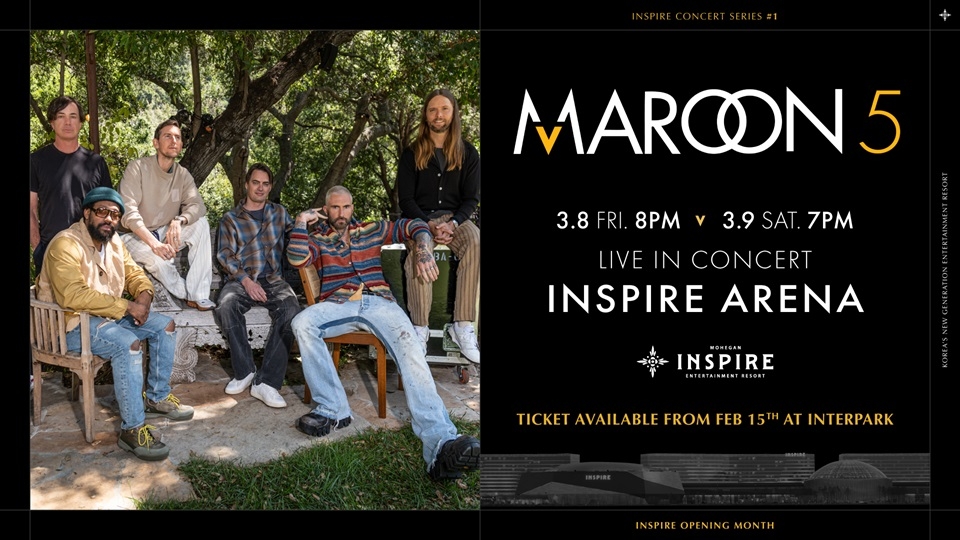15일 모히건 인스파이어 엔터테인먼트 리조트에 따르면 마룬5는 오는 3월 8~9일 인스파이어 아레나에서 내한 공연을 개최한다.