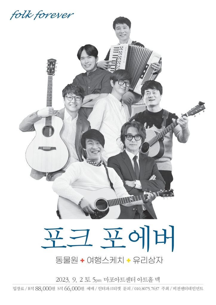 (서울=연합뉴스) 임지우 기자 = ▲ 포크 전설들의 만남 '포크 포에버' = 포크 그룹 동물원, 여행스케치, 유리상자를 한 무대에서 만날 수 있는 콘서트 '포크 포에버'가 9월 2일 서울 마포아트센터 아트홀 맥에서 열린다고 기획사 비전엔터테인먼트가 17일 밝혔다.