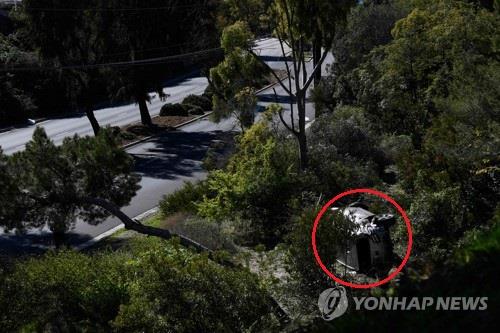 | ▲ 전복사고가 난 내리막 곡선구간. 사진 오른쪽 아래에 우즈가 몰던 차가 놓여 있다. [AFP=연합뉴스] |