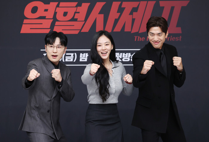 The stars of the new drama "The Fiery Priest Season 2" -- Seo Hyun-woo, Kim Hyung-seo and Seo Hyun-woo (L to R) -- pose for a photo during a publicity event in Seoul on Nov. 8, 2024. The first episode of the drama will air on SBS TV network the same day. (Yonhap)