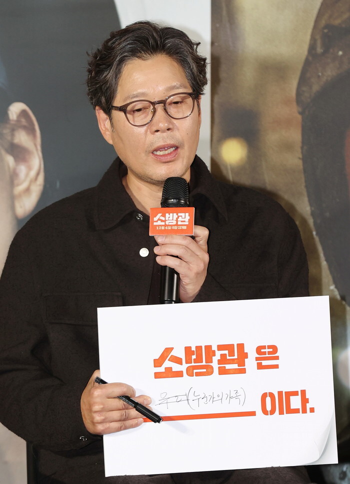 South Korean actor Yoo Jae-myung, who stars in the new movie "The Firefighters," speaks during an event in Seoul on Nov. 8, 2024, to promote the movie, set to hit local screens in South Korea on Dec. 4. (Yonhap)