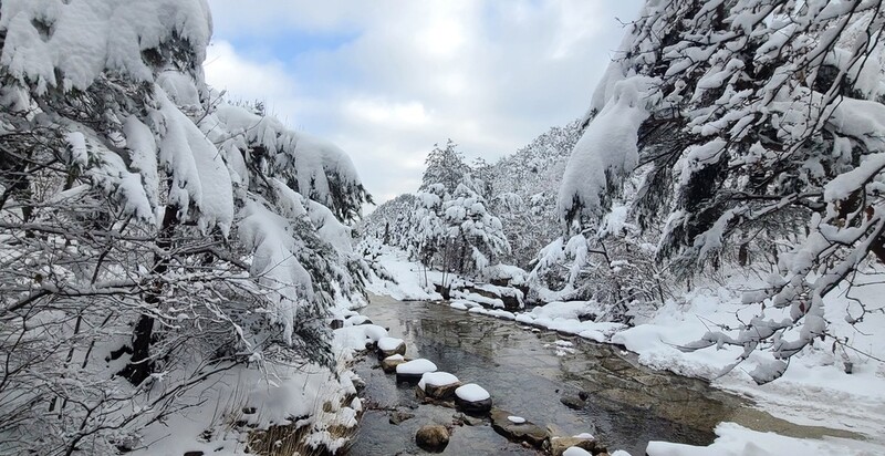 올라간 기온에 눈이 녹으면서 무게를 감당하지 못하고 나뭇가지에서 가끔 떨어지는 눈에 깜짝 놀라 산 쪽을 올려다보면 눈 덮인 숲이 한폭의 산수화를 연상케 한다.