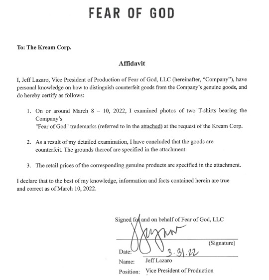 크림은 이날 공지문으로 이런 내용을 밝히면서 피어 오브 갓 본사의 생산총괄 부사장 제프 라자로(Jeff Lazaro) 명의로 된 확인서를 공개했다.