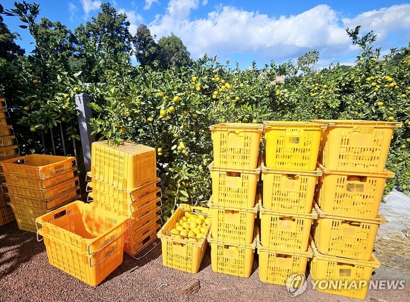 | ▲ 제주 감귤 수확철 컨테이너 본격적인 감귤 수확 철인 가을 제주 서귀포시 한 감귤 농원의 감귤 수확 상자. 2025.11.2. [연합뉴스 자료사진] |