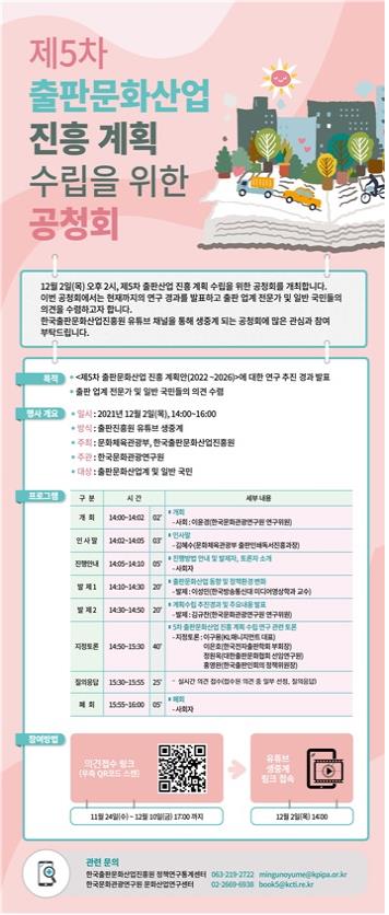 공청회는 별도 신청 없이 출판진흥원 유튜브 채널에서 볼 수 있다. 공청회 이후에도 12월 10일까지 출판진흥원(kpipa.or.kr) 누리집에서 제5차 계획(안)에 대한 의견을 수렴한다.