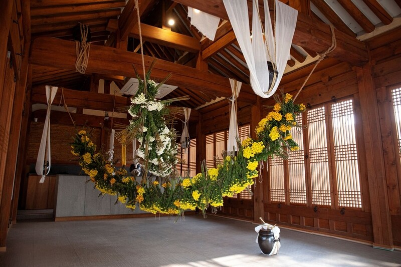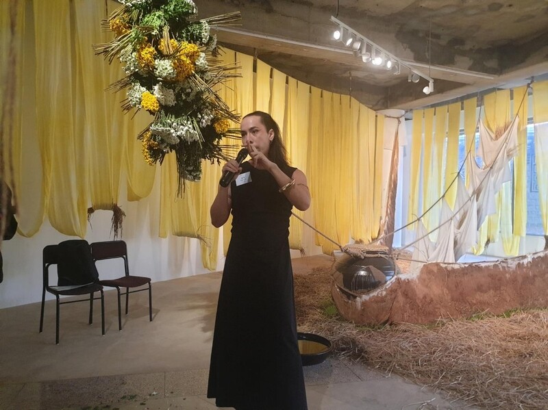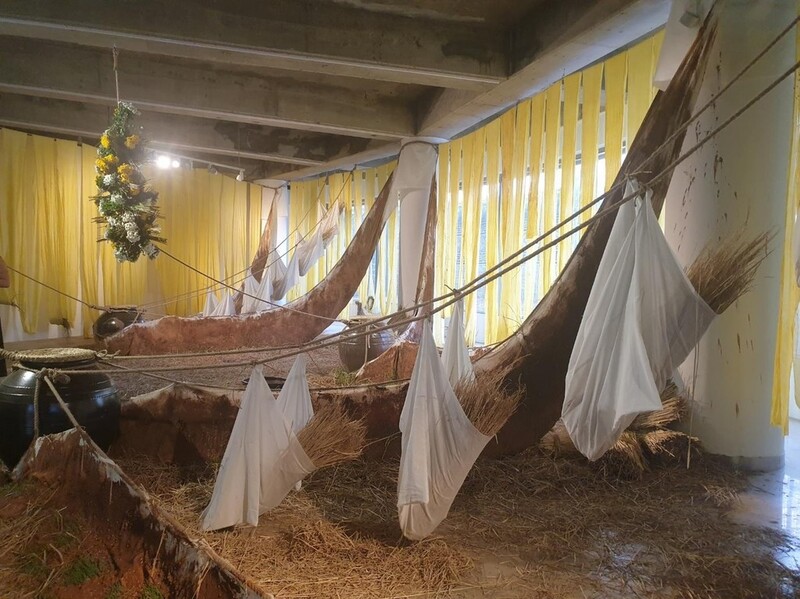 울금으로 노랗게 염색한 직물들이 전시장을 둘러싼 가운데 곳곳에 놓인 흙더미에서는 새싹과 버섯 종자가 심어졌고 장례에 쓰이는 국화와 삼베, 면포로 만든 구조물이 천장에 매달렸다. 군데군데 놓인 옹기에는 쌀과 누룩이 들어있다.