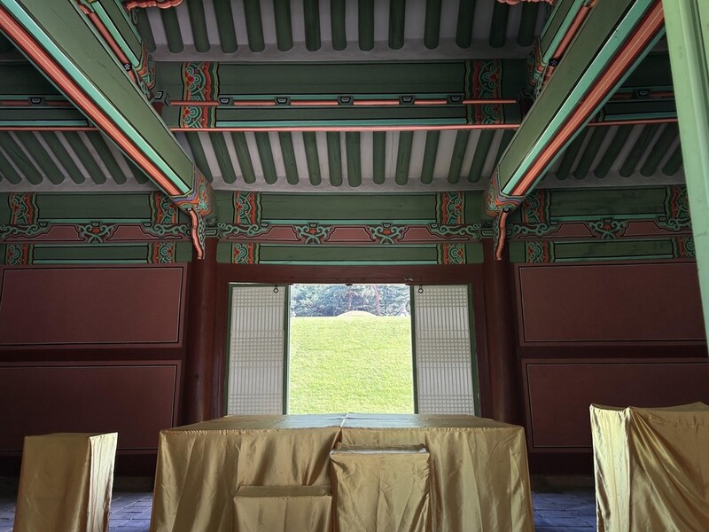 | ▲ 정자각 안에서 바라본 인종의 마지막 쉼터 (고양=연합뉴스) 김예나 기자 = 8일 일반 관람객에게 공개된 고양 서삼릉 효릉의 정자각 안에서 능침을 바라본 모습. 문 너머로 조선 제12대 왕 인종의 무덤이 보인다. 2023.9.8 yes@yna.co.kr |