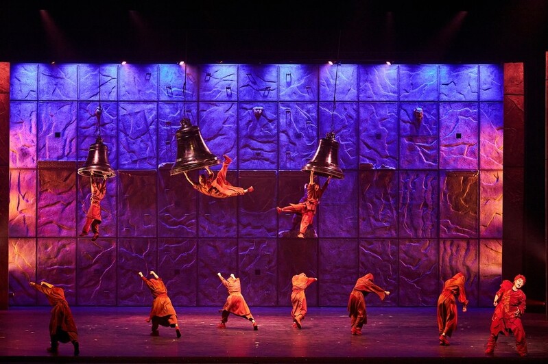 콰지모도가 성당의 종을 울리며 에스메랄다를 향한 마음을 표현하는 노래 '성당의 종들'은 곡예에서 나오는 에너지를 단적으로 보여준다. 이 장면에서 무용수들은 무대에 매달린 대형 종을 좌우로 크게 흔드는 곡예를 선보이며 주인공의 감정을 뒷받침한다.