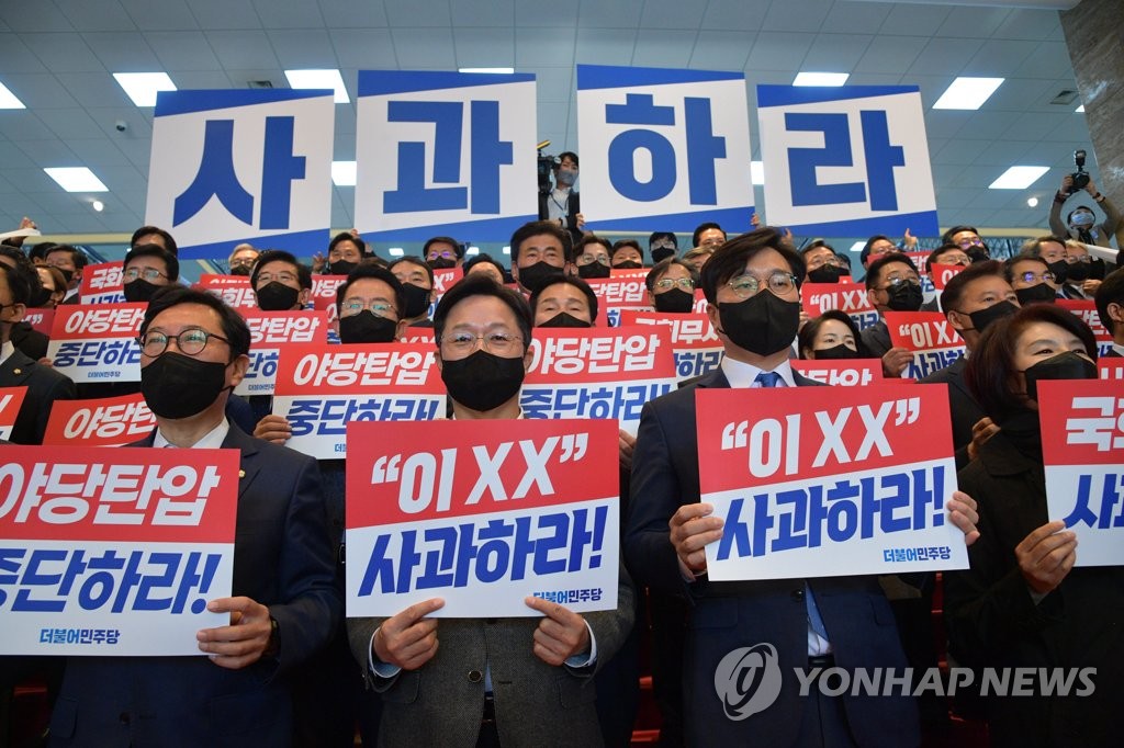 "We condemn Yoon Suk-yeol government for neglecting people's livelihood and suppressing the opposition," DP lawmakers shouted in front of the main chamber.