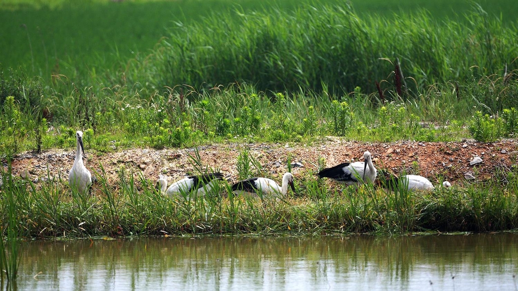 27일 서산시에 따르면 전날 버드랜드 인근에서 황새 부부와 새끼 네 마리가 먹이를 잡는 모습이 카메라에 포착됐다.