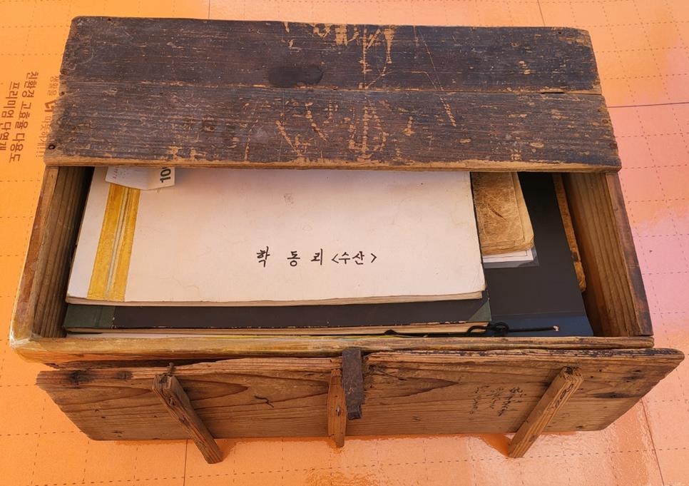 | ▲ 마을에서 고이 보관해 온 지동궤 (거제=연합뉴스) 김예나 기자 = 지난 17일 경남 거제시 동부면 수산마을의 지동궤. 지동궤는 마을의 주요 대소사를 정리한 기록과 주민 대장을 담은 상자로, 마을에서 별신굿이 할 때마다 정성껏 모신다. 2024.2.19 yes@yna.co.kr |