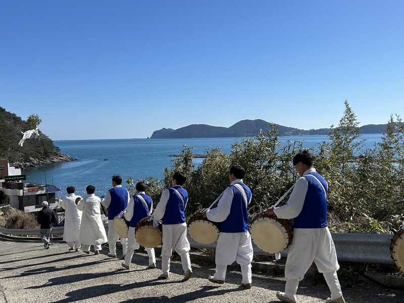 | ▲ 용왕굿을 하러 가는 풍물패 (거제=연합뉴스) 김예나 기자 = 지난 17일 경남 거제시 동부면 수산마을 일대에서 마을의 안녕과 풍어를 기원하는 '거제수산별신굿'이 열리고 있다. 사진은 용왕굿을 하러 선착장으로 이동하는 모습. 2024.2.19 yes@yna.co.kr |