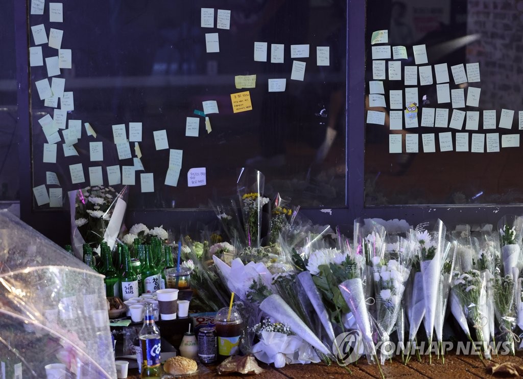 | ▲ Flowers, beverages and messages of condolences lie on an alley near Sillim Station on July 22, 2023, where a man was killed and three others wounded in a stabbing rampage a day before. (Yonhap) |