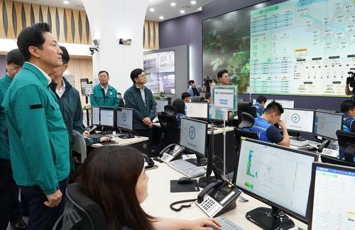 | ▲ This image provided by the Seoul city government shows Mayor Oh Se-hoon (L) inspecting the city's disaster monitoring office in Seoul on July 13, 2023. (PHOTO NOT FOR SALE) (Yonhap) |