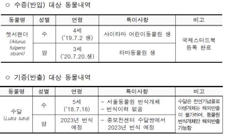 이에 따라 양측은 수달과 레서판다를 서로 기증하기로 합의했고, 작년 11월 말 레서판다 암·수 1쌍이 국내로 들어왔다.