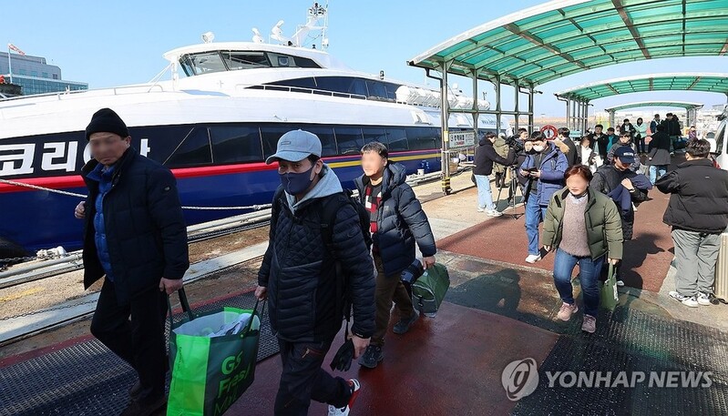 ▲ 귀경객으로 붐비는 인천항 연안여객터미널 (인천=연합뉴스) 임순석 기자 = 설 연휴 마지막 날인 12일 오전 인천 중구 인천항 연안여객터미널에 도착한 귀경객들이 이동하고 있다. 2024.2.12 soonseok02@yna.co.kr