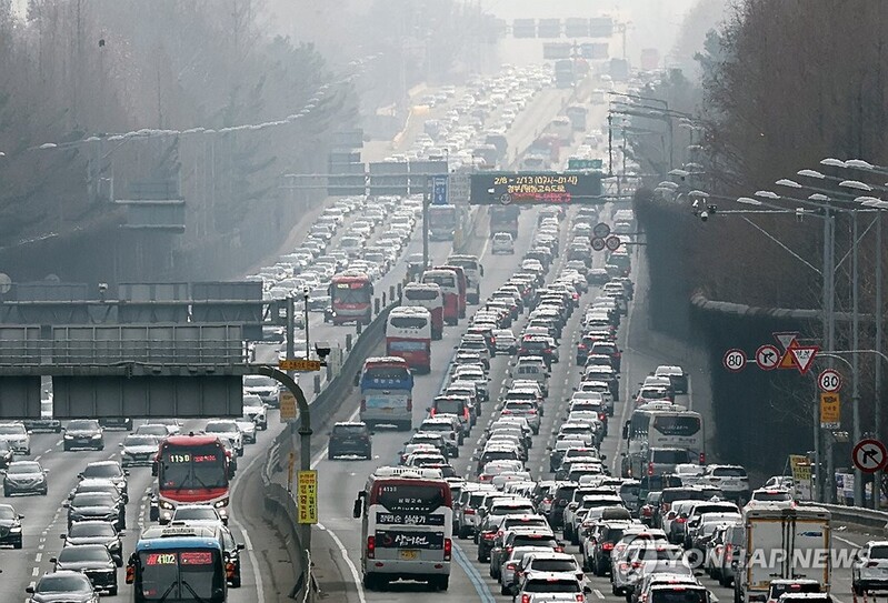 ▲ 끝나가는 설 연휴, 귀경길 시작 (서울=연합뉴스) 윤동진 기자 = 연휴 사흘째인 11일 오후 서울 잠원IC 인근에서 바라본 경부고속도로 상(왼쪽)하행선 모습. 이날 도로공사는 막바지 귀성객과 귀경객들로 양방향 차량 흐름이 모두 혼잡할 것으로 예상했다. 2024.2.11 mon@yna.co.kr