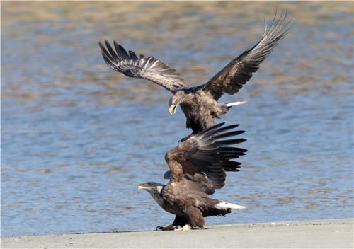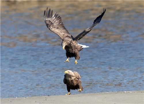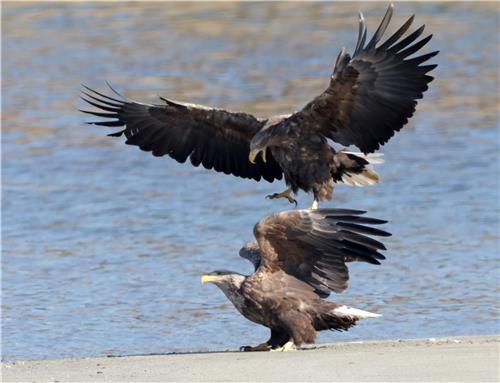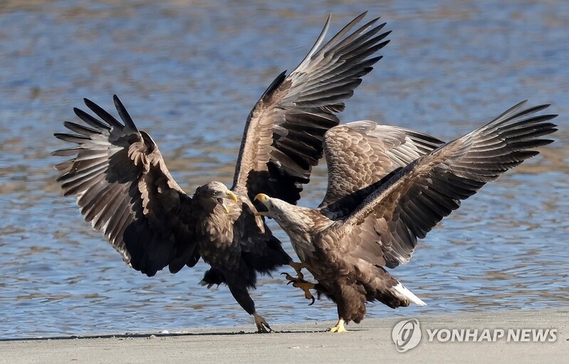 | ▲ 강릉 남대천의 흰꼬리수리 (강릉=연합뉴스) 유형재 기자 = 31일 강원 강릉시 남대천에서 월동 중인 천연기념물이자 멸종위기 야생생물 1급인 흰꼬리수리가 다툼을 벌이고 있다. 부부로 추정되는 이들 흰꼬리수리의 다툼 모습은 짝짓기를 위한 사전 행동으로 추정된다. 2024.1.31 yoo21@yna.co.kr |