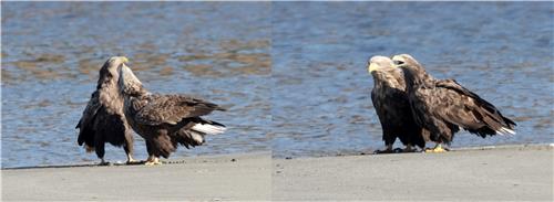 (강릉=연합뉴스) 유형재 기자 = 흰꼬리수리들의 영역 싸움이나 서열 다툼으로 보였던 행동이 사실은?