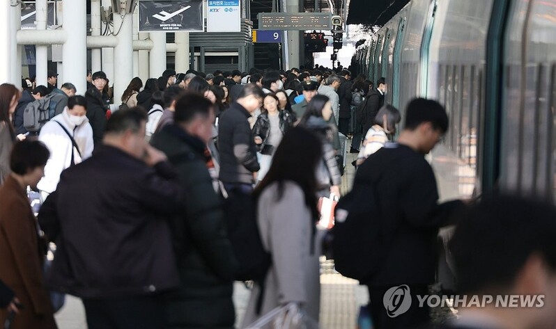 | ▲ 열차 탑승하는 귀성객 (서울=연합뉴스) 최재구 기자 = 설을 앞둔 8일 서울역 열차 승강장에서 귀성하는 시민 등이 열차에 탑승하고 있다. 2024.2.8 jjaeck9@yna.co.kr |
