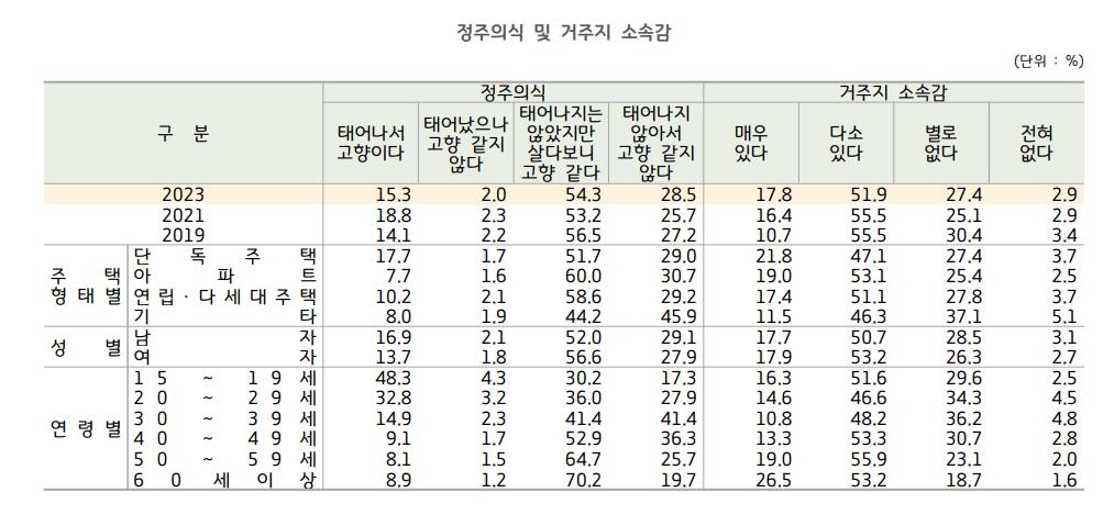 이를 세부적으로 들여다보니 '태어나지는 않았지만 살다 보니 고향 같다'는 응답은 아파트 거주자(60.0%), 여성(56.6%), 60세 이상(70.2%)에서 높았다.