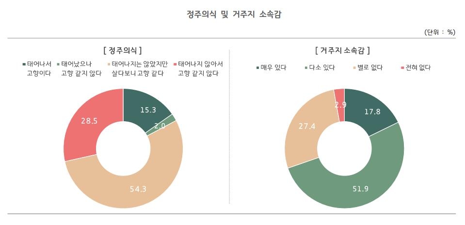 '현재 살고 있는 시군에 대해 어느 정도의 소속감을 느끼는가'에 대한 질문에는 69.7%가 '소속감이 있다'고, 30.3%가 '소속감이 없다'고 답했다. 이는 2021년 조사와 비교해 '소속감이 있다'는 응답이 2.2%포인트 낮아졌다.