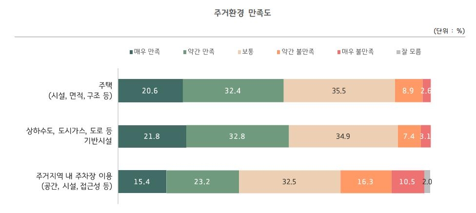 현재 주거환경에 대한 만족도를 보면, 주택 만족 비율은 53.5%, 기반시설 만족 비율은 54.6%, 주거지역 내 주차장 만족 비율은 38.6%로 조사됐다.