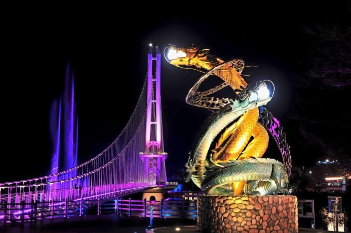 ▲ 예당호 출렁다리와 음악분수, 용 조형물 [예산군 제공. 재판매 및 DB 금지]