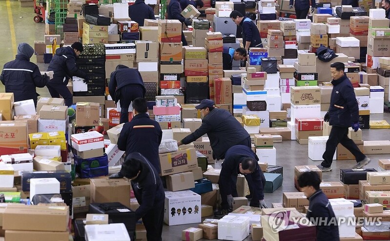 | ▲ 설 명절 비상근무 돌입한 동서울우편물류센터 (서울=연합뉴스) 김성민 기자 = 설 연휴를 앞둔 1일 오전 서울 광진구 동서울우편물류센터에서 작업자들이 택배 분류작업을 하고 있다. 우정사업본부는 지난달 29일부터 오는 14일까지 약 16667만개의 소포 우편물 접수가 예상된다며 비상근무체계에 돌입한다고 밝혔다. 2024.2.1 ksm7976@yna.co.kr |