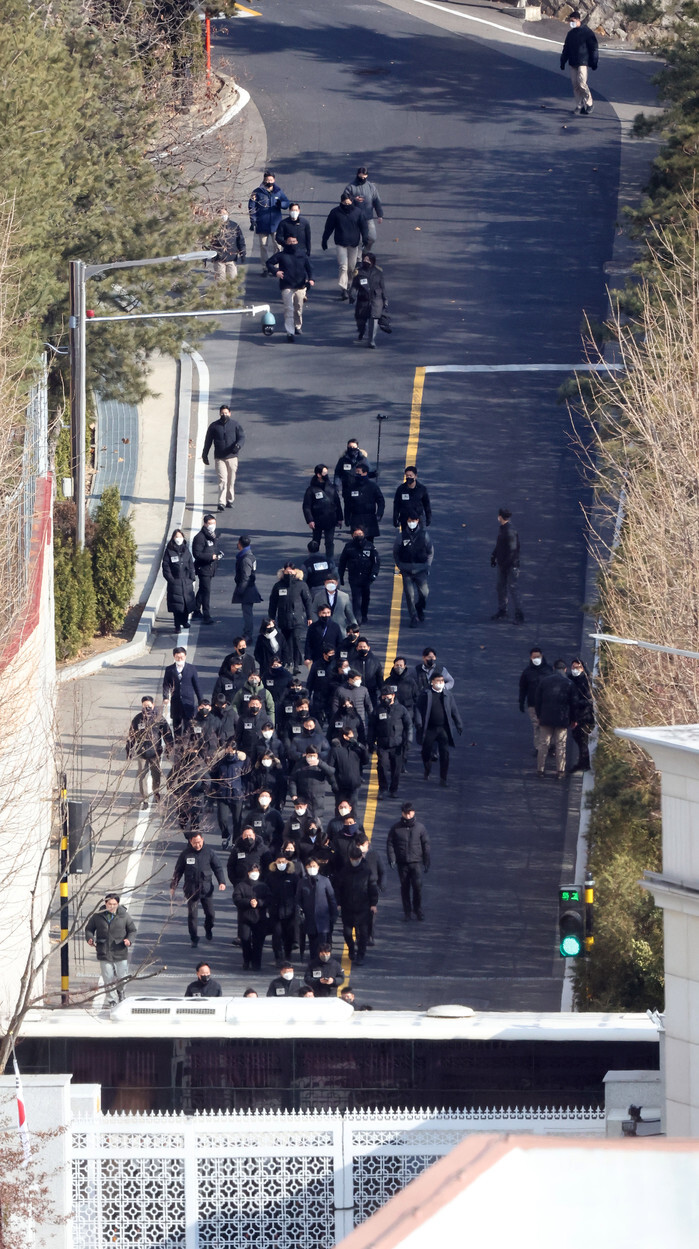 Investigators from the state anti-corruption agency and police officers leave the premises of impeached President Yoon Suk Yeol's official residence in Seoul on Jan. 3, 2025, after failing to execute a warrant to detain Yoon over his failed bid to impose martial law in December. The agency, known as the Corruption Investigation Office for High-ranking Officials, suspended its attempt to execute the warrant following an hourslong standoff between investigators and presidential security staff. (Yonhap)