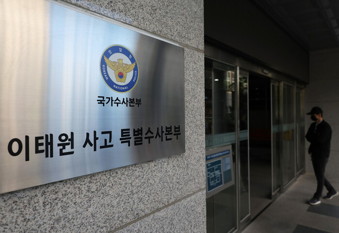 A signboard for a special investigation team is set up at Mapo Police Station in Seoul on Nov. 6, 2022. Police earlier announced that an independent body of investigators will look into whom or what caused the deadly accident. (Yonhap)