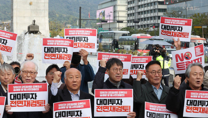 Civic activists chant slogans in central Seoul on Oct. 21, 2025, calling for a comprehensive review of South Korean investments planned for the United States. (Yonhap)