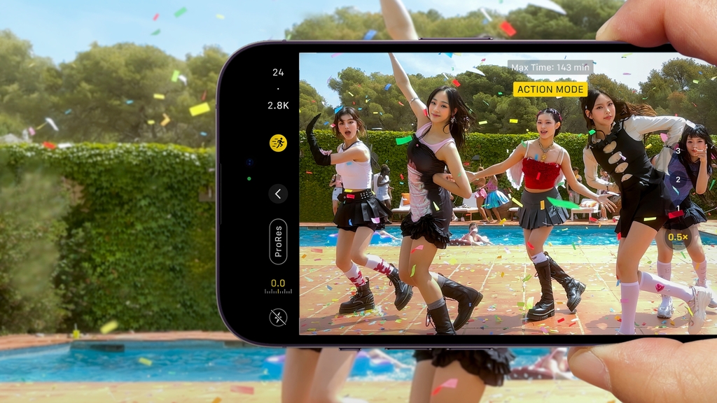 애플은 아이폰 카메라의 '액션 모드'로 뉴진스의 댄스 시퀀스를 담아냈으며, '시네마틱 모드'로 깊이감 있는 영상미를 구현했다고 소개했다.