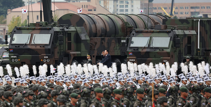 President Yoon Suk Yeol (C) passes by a transporter erector launcher carrying a Hyunmoo-5 missile as he inspects troops gathered for a ceremony marking Armed Forces Day at Seoul Air Base in Seongnam, just south of Seoul, on Oct. 1, 2024. (Pool photo) (Yonhap)