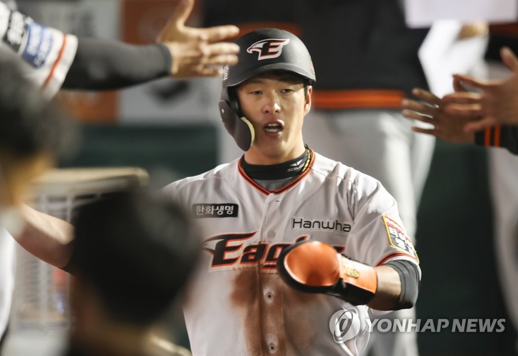 | ▲ In this file photo from Oct. 30, 2020, Ro Soo-kwang of the Hanwha Eagles is congratulated by teammates after scoring a run against the KT Wiz in the bottom of the fifth inning of a Korea Baseball Organization regular season game at Hanwha Life Eagles Park in Daejeon, 160 kilometers south of Seoul. (Yonhap) |
