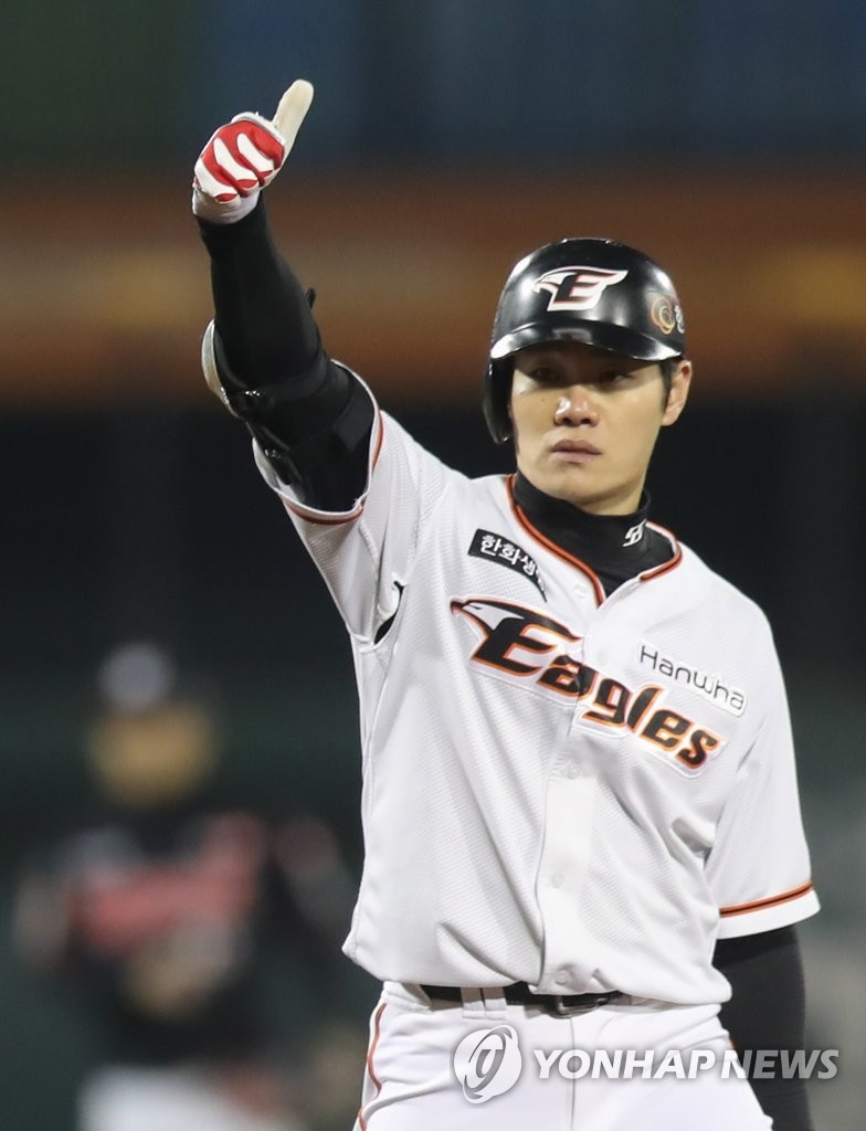| ▲ In this file photo from Oct. 30, 2020, Kang Kyung-hak of the Hanwha Eagles celebrates his RBI double against the KT Wiz in the bottom of the fifth inning of a Korea Baseball Organization regular season game at Hanwha Life Eagles Park in Daejeon, 160 kilometers south of Seoul. (Yonhap) |