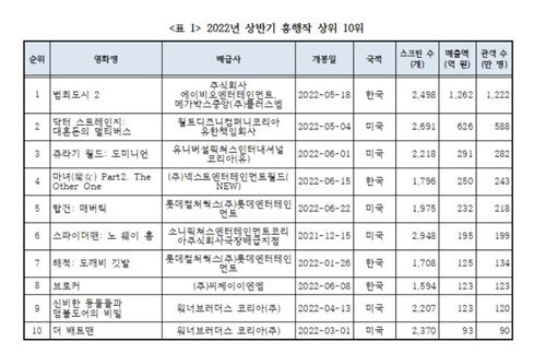 | ▲ 2022년 상반기 흥행작 순위 [영화진흥위원회 '2022년 상반기 한국영화산업 결산' 보고서 캡처. 재판매 및 DB 금지] |